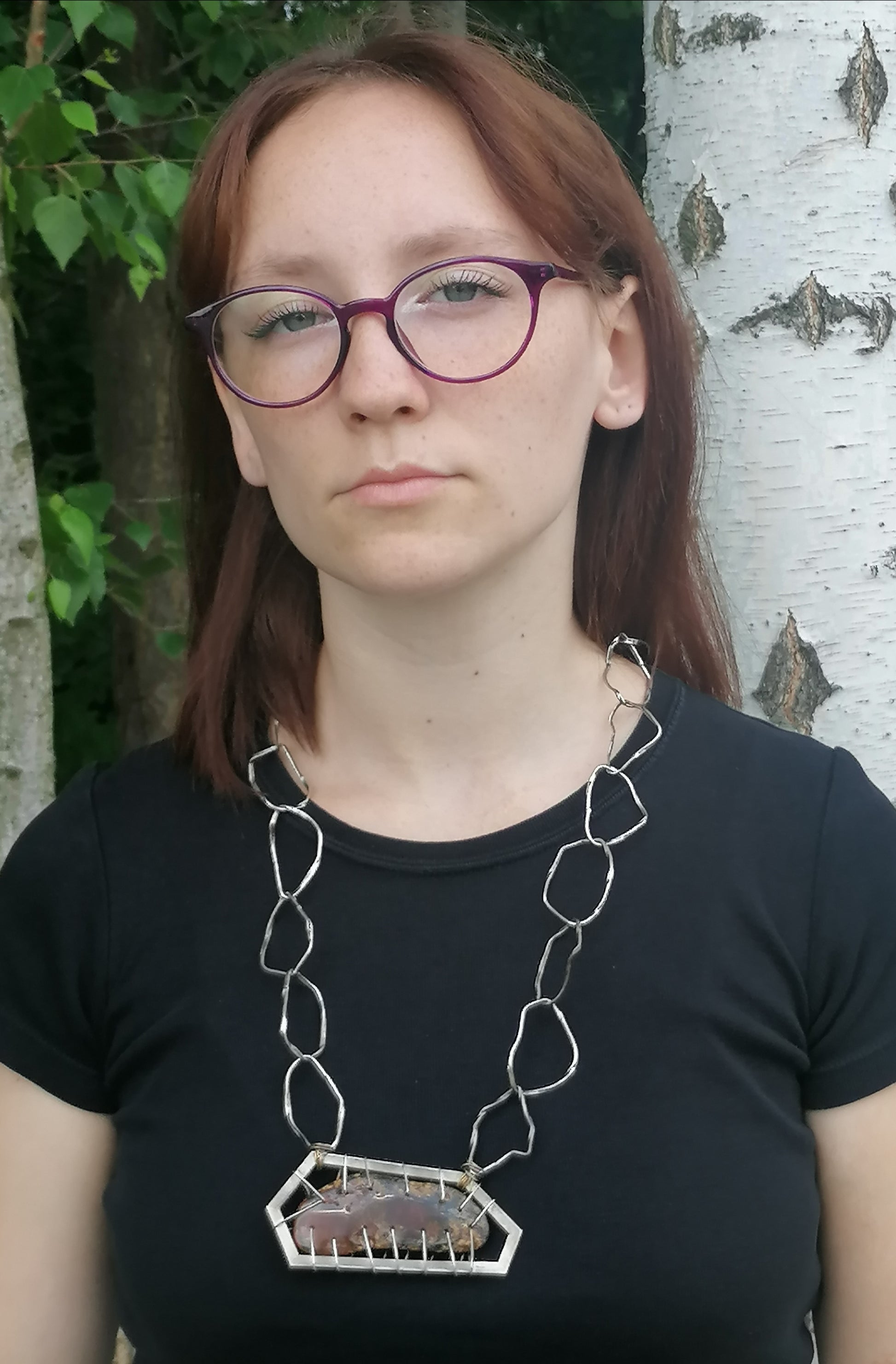 A silver necklace that is not only a decoration, but also a work of art. Each link of this silver chain is elongated and irregular. The focal point is amber, trapped - literally sewn to a geometric 925 silver frame, which has been handcrafted to compliment the natural, raw texture of amber. It is like a drop of golden sunshine caught in time. Its warm, organic shades sparkle with a variety of colors - from deep honey to light gold. Every irregularity and inclusion adds depth and character. The amber is intricately framed in silver, which delicately highlights its natural beauty, creating a harmonious whole with the rest of the necklace.