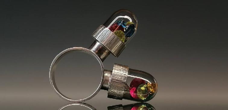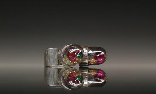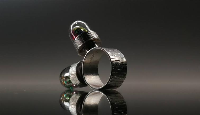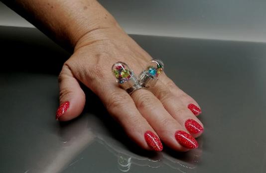 Futurystyczny srebrny pierścionek z dwoma kopułami