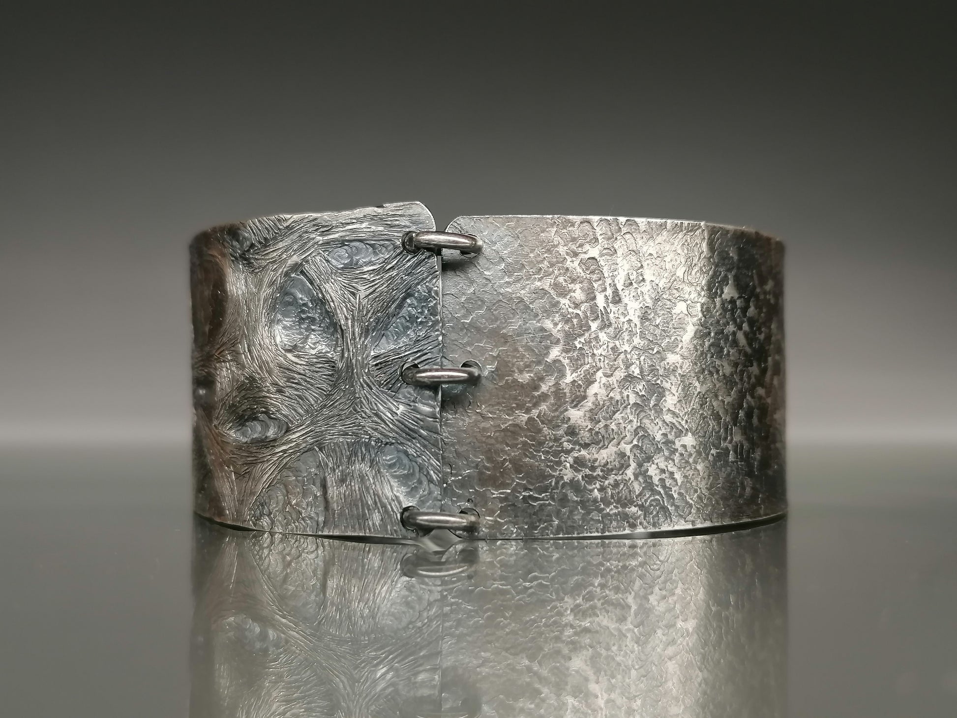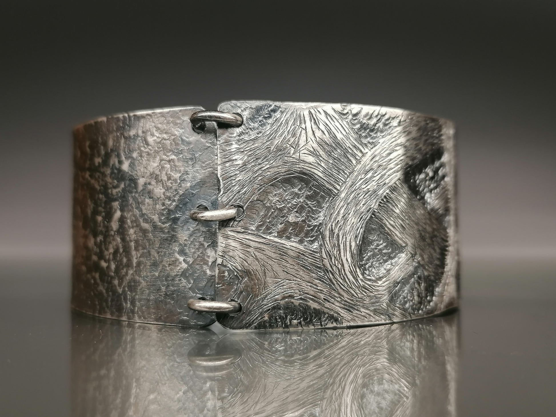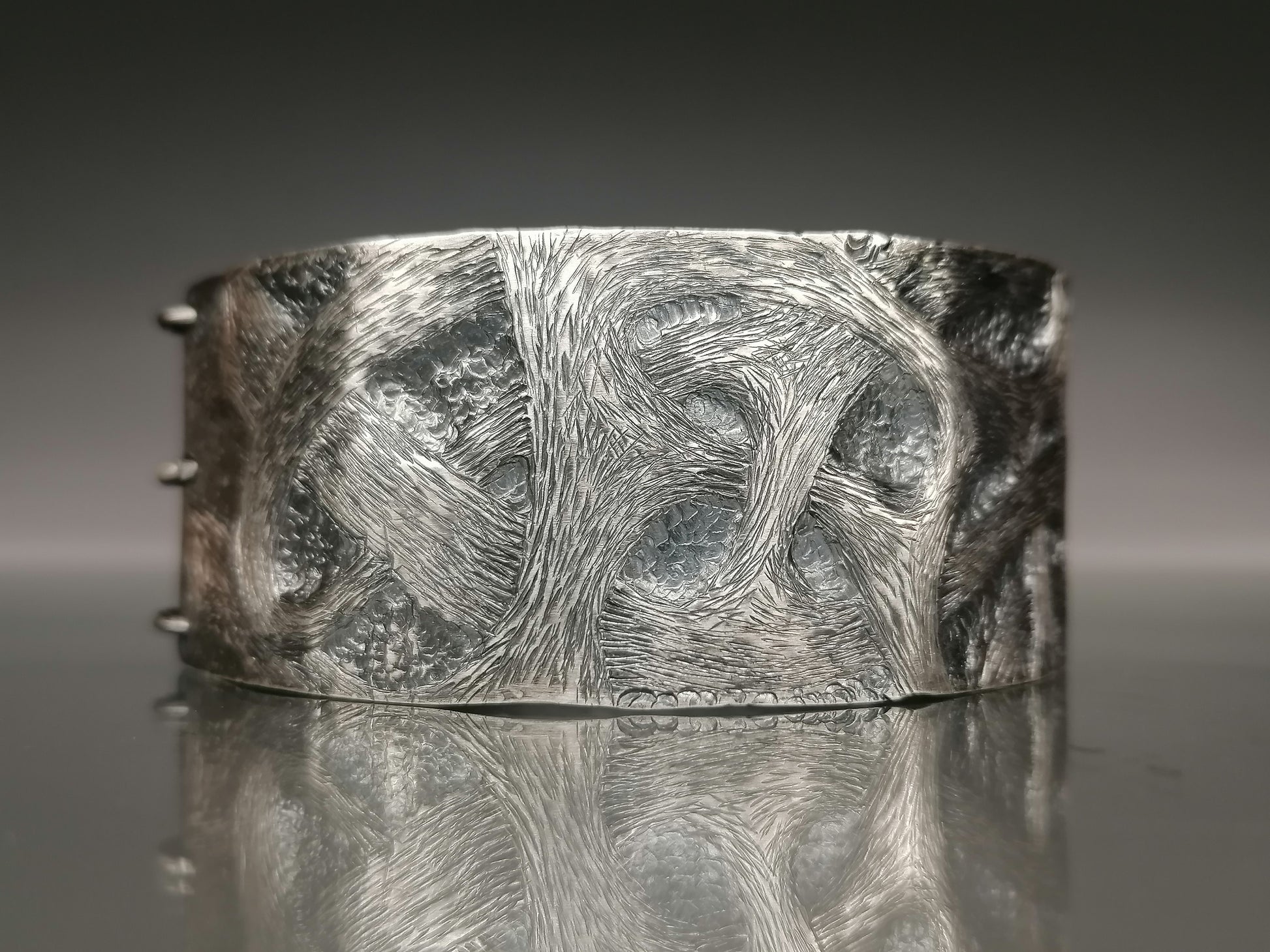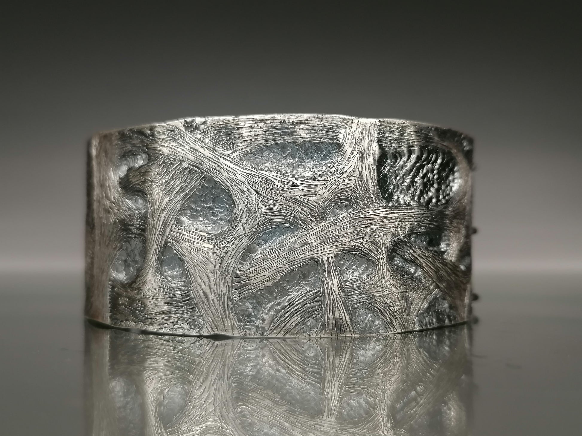 The unique hand-forged 925 silver bracelet delights with its unique pattern. Its surface is covered with intricate, swirling patterns resembling natural structures such as wood grains or water shapes. Hand processing gives it a contrast between polished and matte surfaces, which adds depth and complexity to the design. The bracelet has a wide, cuff shape with rounded edges. This unique piece of jewelry combines elegance with a hint of severity.
